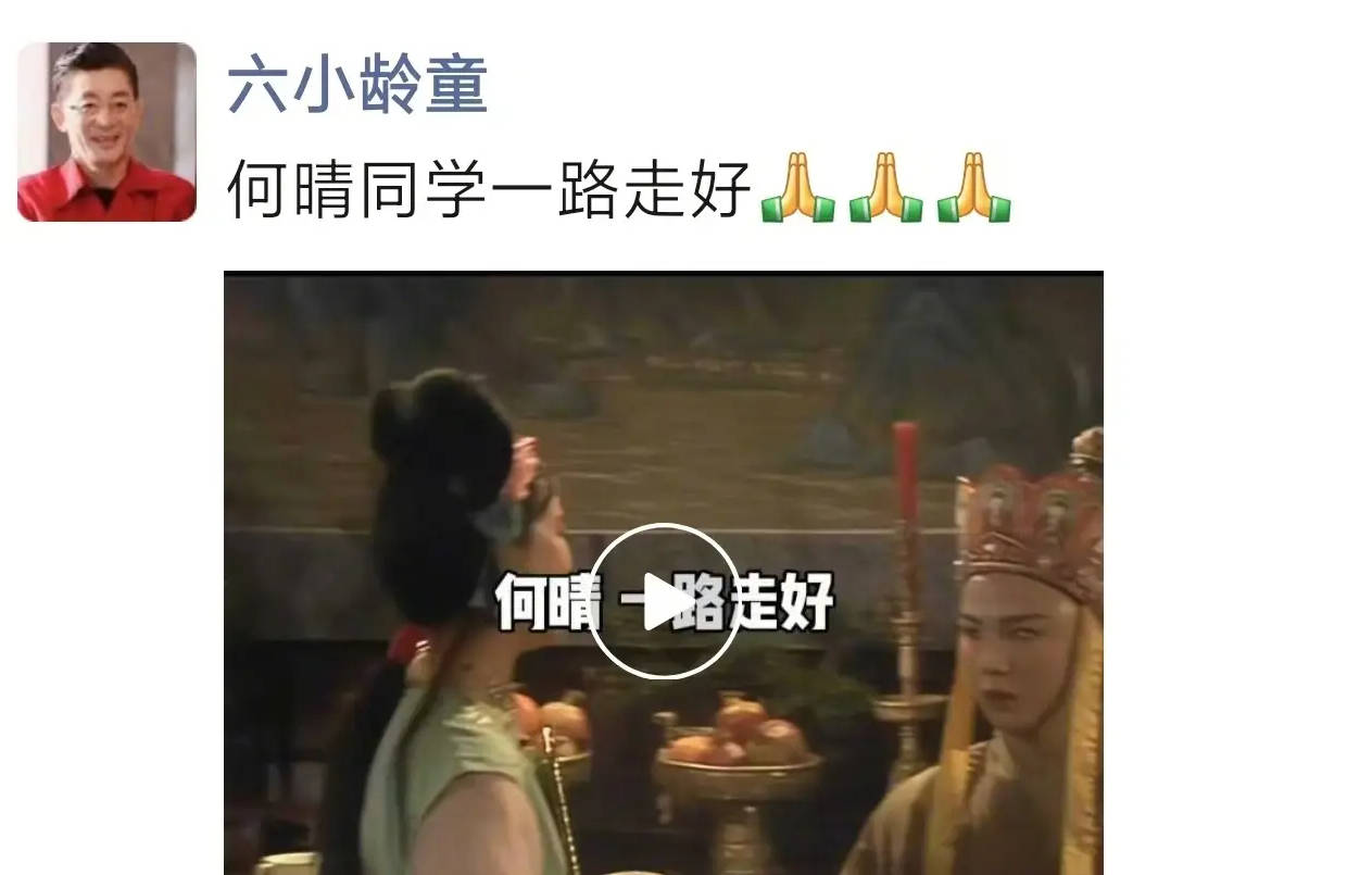 13日,演员何晴去世,享年61岁。14日,演员六小龄童在朋友圈发文悼念何晴:何晴同学一路走好。