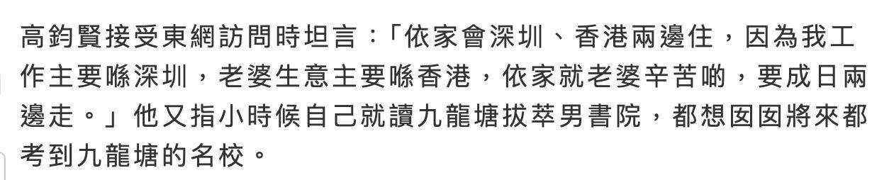 976方尺的房产在香港也能称为豪宅,不过对于高钧贤夫妇来说,如此大小的房产比起他们如今在深圳所住的2000尺的豪宅,那还真是没什么好比较的。房子不但不大,价格还很高,但高钧贤夫妇还会买下必然会有特别的原因。在香港买房除了保值或者说等升值之外,对于高钧贤夫妇来说,其实也是方便居住生活。高钧贤自曝如今自己的工作场所在深圳,所以自己在深圳生活的时间更多,而妻子的生意在香港,那么在香港买房也是希望有一处安身之所。当然除了这个原因之外,或多或少还是要为女儿读名校铺路,高钧贤称自己小时候就读的是九龙塘拔萃男书院,希望女儿日后也能读九龙塘名校,而笔架山刚好位于九龙塘的西侧,如此一来上下学就方便不少。