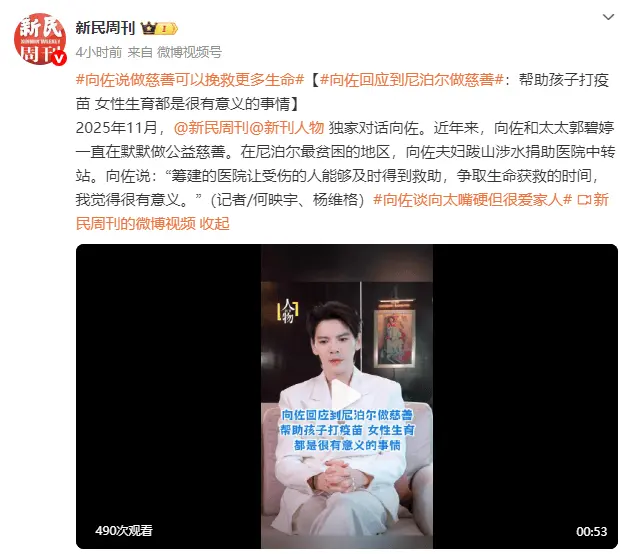 2025年11月,《新民周刊》“新刊人物”栏目对向佐进行了独家专访。近年来,向佐与妻子郭碧婷始终低调投身公益慈善事业,在尼泊尔最偏远贫困的区域,夫妇二人不辞辛劳跋