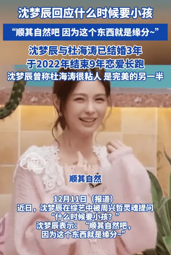 近日,沈梦辰在某综艺里被周兴哲犀利提问:“什么时候要小孩?”对此,沈梦辰坦然回应:“顺其自然吧,毕竟这种事讲究的就是缘分。”而就在此前,沈梦辰和杜海涛还晒出合照庆祝结婚3周年,配文“4266 天快乐”,甜度爆表。据悉,两人曾经历9年恋爱长跑才步入婚姻殿堂,沈梦辰更是不止一次称赞杜海涛是自己“完美的另一半”。