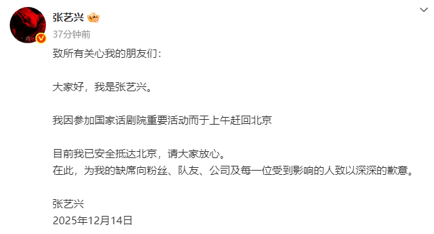 14日,EXO举办见面会,原定出席的张艺兴缺席,引发热议。当天,张艺兴发文回应此事:“我因参加国家话剧院重要活动而于上午赶回北京。目前我已安全抵达北京,请大家放心。在此,为