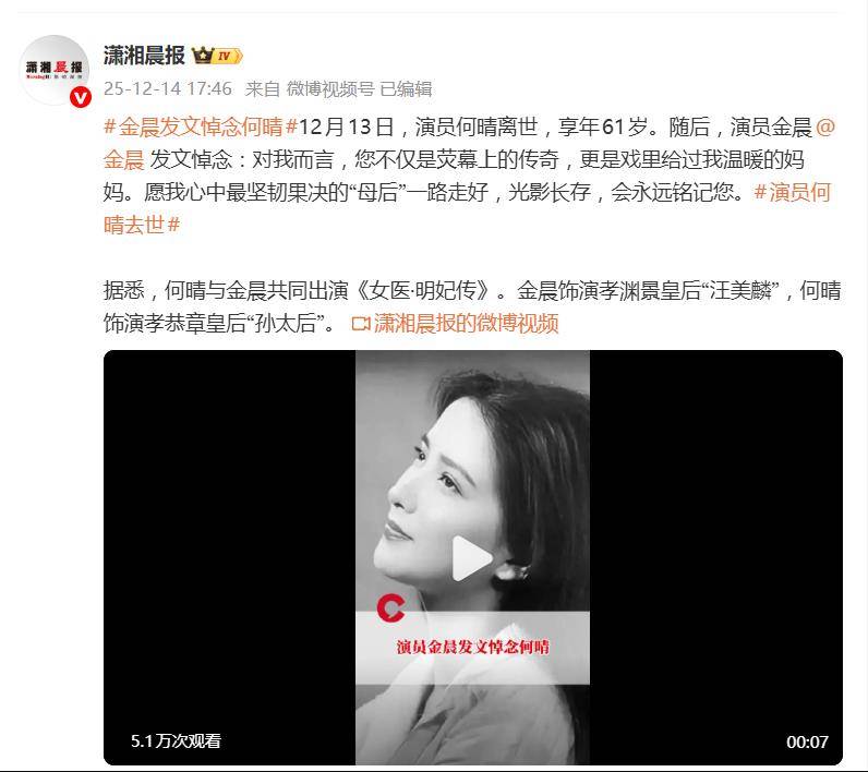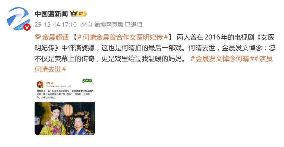 一句“戏里给过我温暖的妈妈”,让金晨的悼念冲上了热搜,也让无数网友再次将目光聚焦于悄然离世的传奇演员何晴。在何晴离世次日(12月14日),这份来自“戏中儿媳”的追思,瞬间击穿了公众心防,唤起的不仅是对一位艺术家逝去的惋惜,更是对她艺术生命与人性光辉的双重致敬。