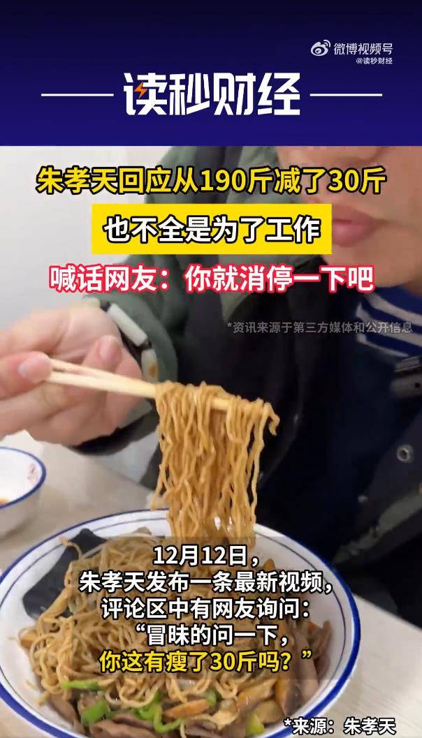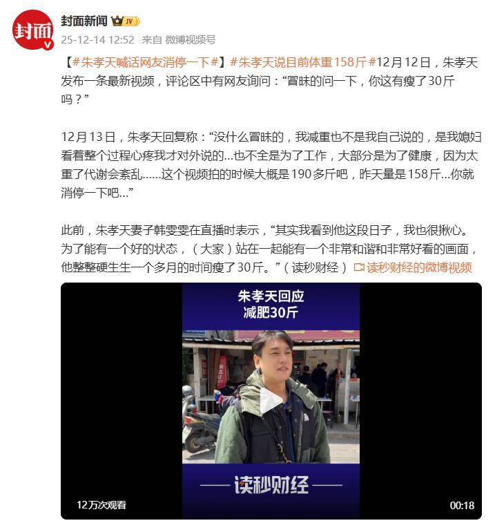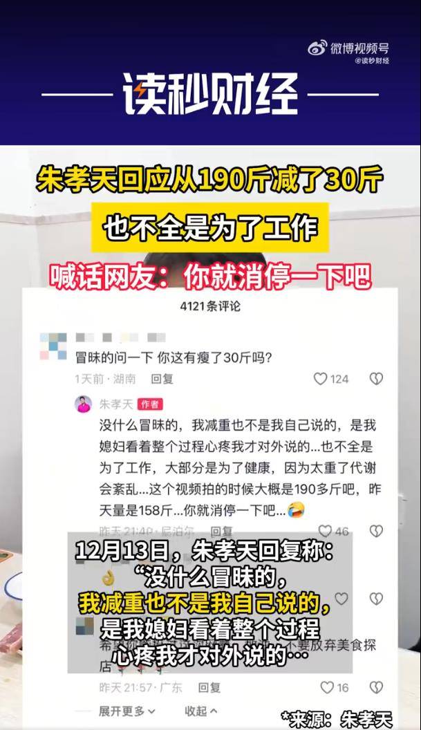 据12月14日报道,12月13日,朱孝天在视频评论区亲自下场回应。他直言减重消息并非自己主动宣扬,“是我媳妇看着整个过程心疼我才对外说的”。他更强调初衷“大部分是为了健康”,因为体重过大会导致代谢紊乱,工作只是部分原因。他还给出了具体数据:拍视频时190多斤,现在已降至158斤,减重幅度超过30斤。
