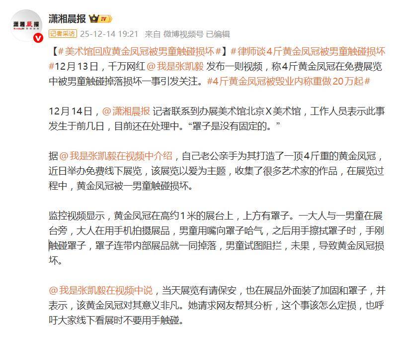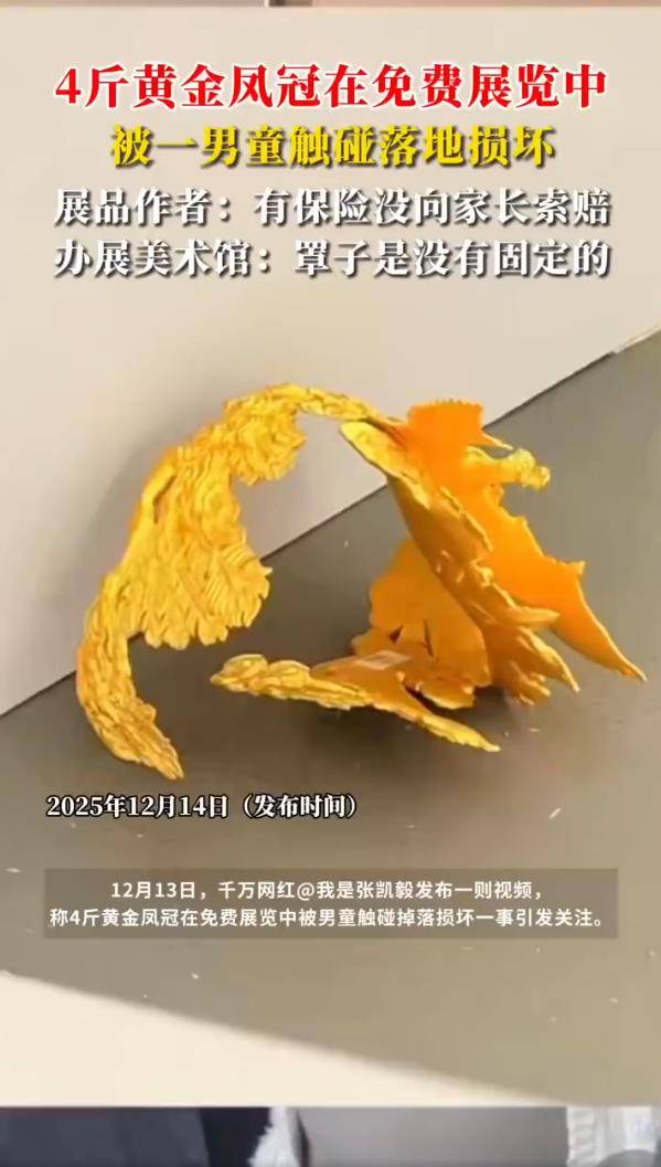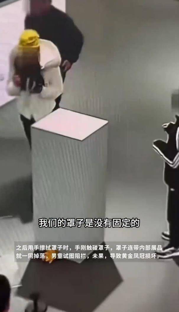 据张凯毅描述,这顶凤冠是她珍贵的私人藏品,参与了一个以爱为主题的免费线下展览。然而,展览期间意外发生:一名男童在展品前疑似用手触碰了保护罩,导致罩子连同内部的黄金凤冠一同从约一米高的展台上摔落,造成损坏。监控画面显示,当时男童身旁有大人正在用手机拍摄展品,男童对罩子哈气并用手擦拭,随后罩子滑落。