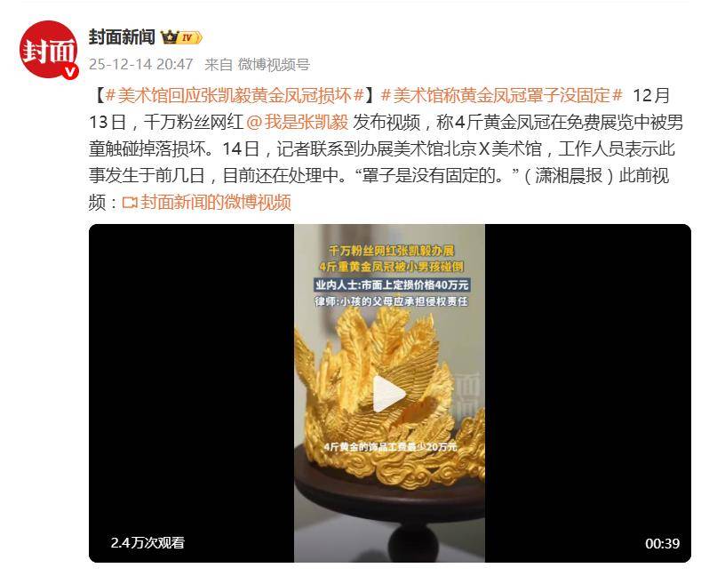 近日,一条视频在网络上炸开了锅。千万粉丝网红张凯毅发布视频,称自己那顶由老公亲手打造、重达4斤的黄金凤冠,在一次免费艺术展览中,竟被一名男童触碰导致损坏。一时间,关于“熊孩子”与“博物馆文明”的老话题,再次被推上风口浪尖。