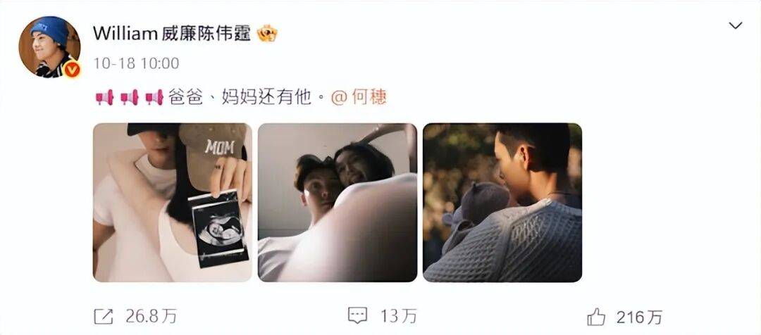 但没想到的是,在今年10月,陈伟霆与何穗无预警地在社交平台上抛出一个“炸弹”,晒出一家三口的合照,并留言:爸爸、妈妈,还有他。