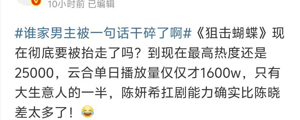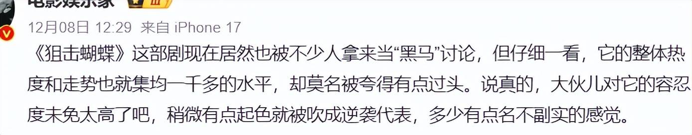 可实际上《狙击蝴蝶》算越级碰瓷,《大生意人》虽然播放量还没起色,但是收视率没短板,而《狙击蝴蝶》却要差很多,远达不到爆剧的门槛。