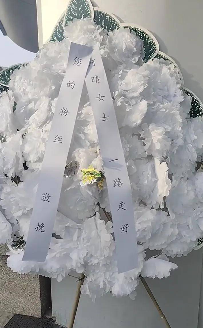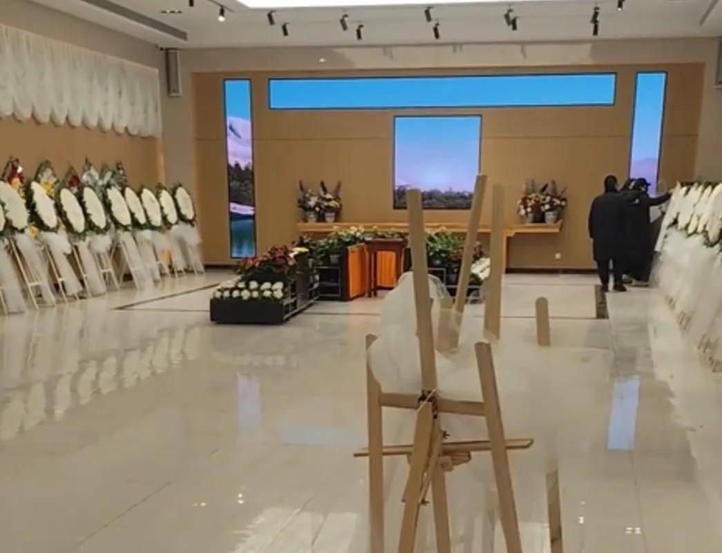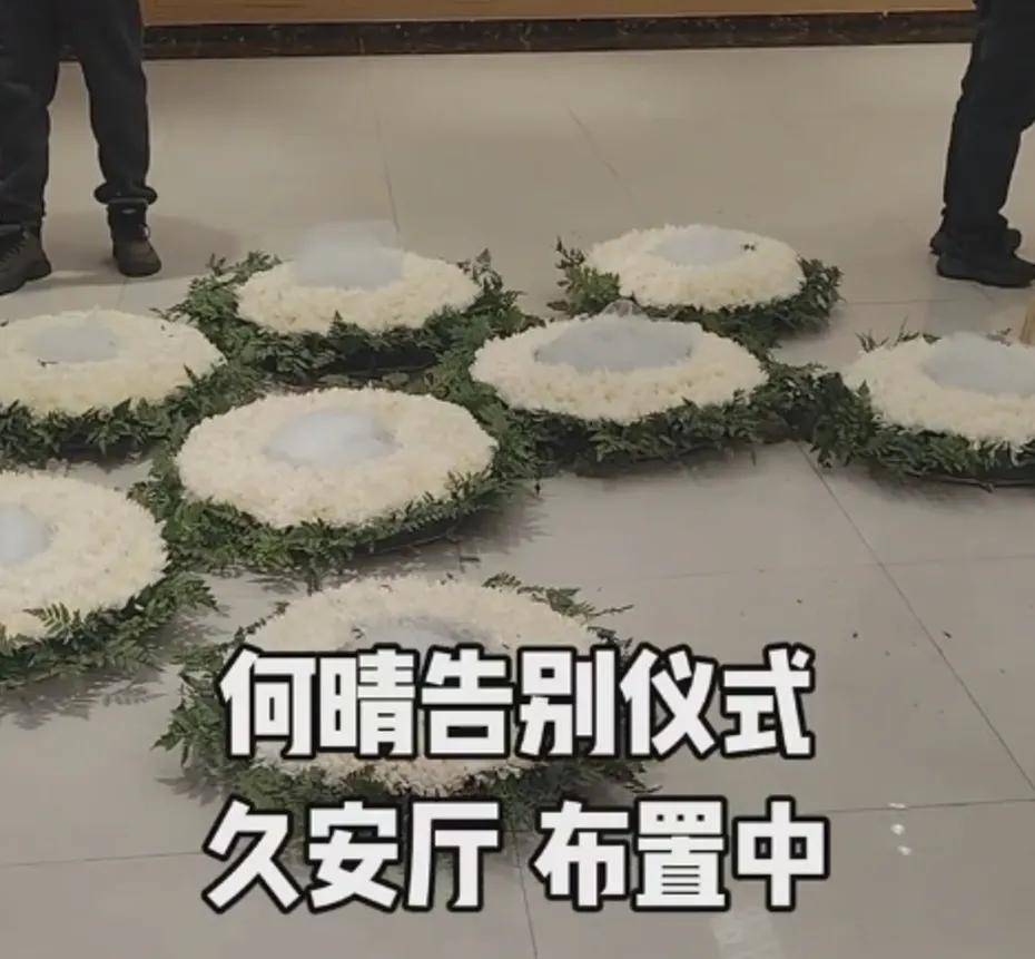 有网友晒出为何晴告别仪式做准备的画面,众人一早就开始布置了,大厅两边摆满纯白色的花圈。