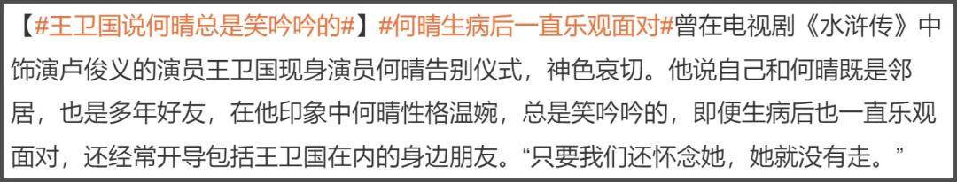 而在电视剧《水浒传》饰演卢俊义的男演员王卫国,也现身接受媒体采访。他透露他和何晴既是邻居也是多年好友,两人常有往来,何晴没事儿的时候还去王卫国家聊天,有时候何晴还会打电话让王卫国送她去医院。没想到何晴生病最常照顾她的是朋友和邻居。
