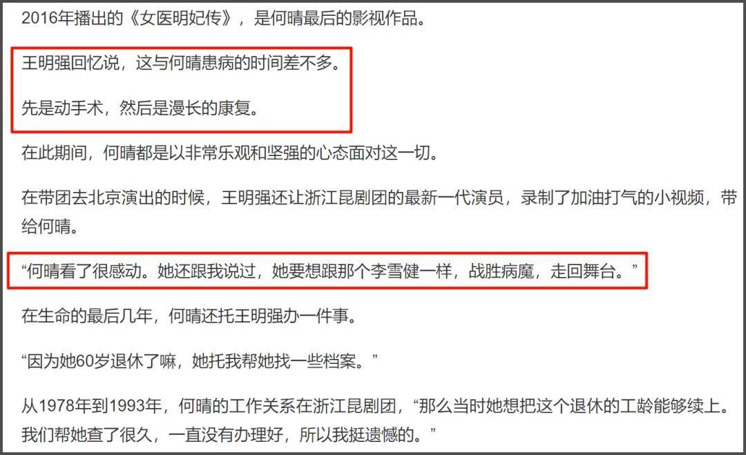 王明强还带去了剧团小演员的加油打气视频,何晴非常感动,还说自己想像李雪健一样,“战胜病魔,走回舞台”,可惜最终也没能如愿。最后就希望何晴一路走好,愿天堂再无病痛!