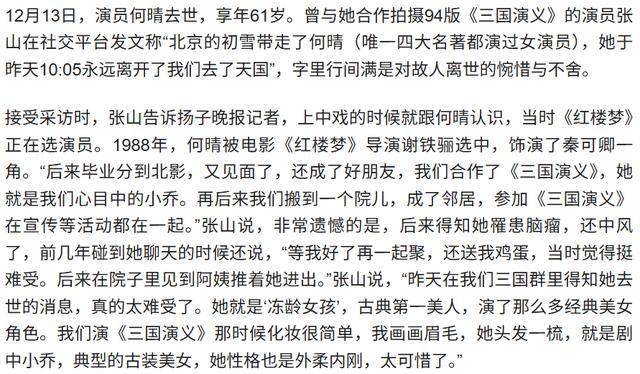 该网友的说法得到了她好友、赵云扮演者张山的证实。张山说,除了脑瘤,她后来还中风了。前几年碰到,她还送了他鸡蛋,说好了要聚一聚。他听后觉得挺难受的。后来他在院子里看到阿姨推她进出。