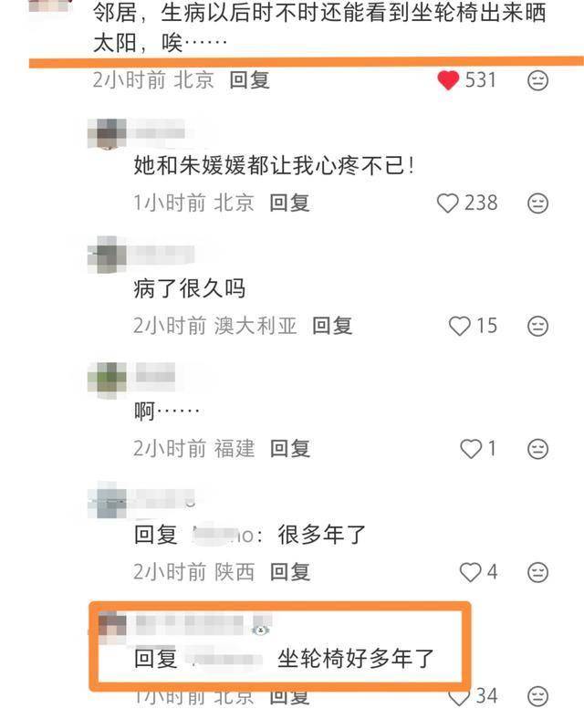 该网友还说,她生病以后时不时还能看到坐轮椅出来晒太阳。网友进一步强调,她“坐轮椅好多年了”。