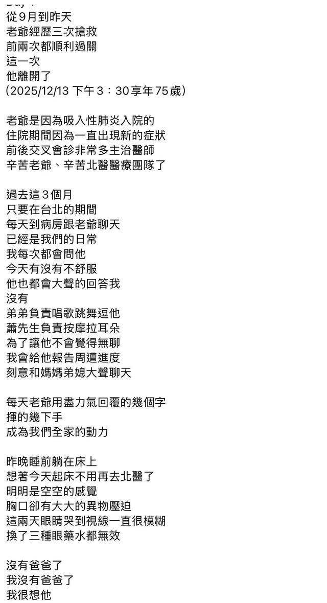 父亲离世,林有慧悲痛表示,“昨晚睡前躺在床上,想着今天起床不用再去北医了,明明是空空的感觉,胸口却有大大的异物压迫。这两天眼睛哭到视线一直很模糊,换了三种眼药水都无效,没有爸爸了,我没有爸爸了,我很想他。”