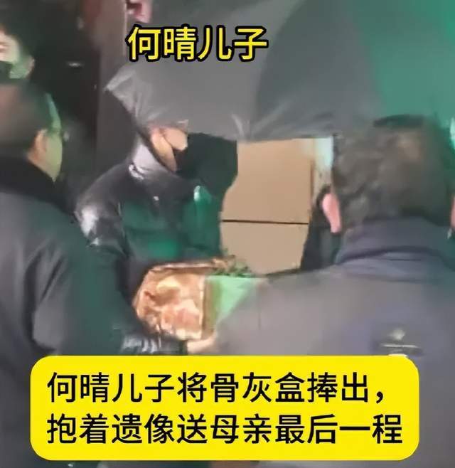 告别式结束后,何晴儿子捧着骨灰走出大厅,一脸悲伤,双眼无神,似乎无法接受母亲去世,身边也未见家长陪伴。将母亲骨灰安放好后,他又捧着遗像跟在后面。