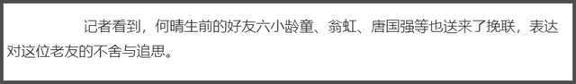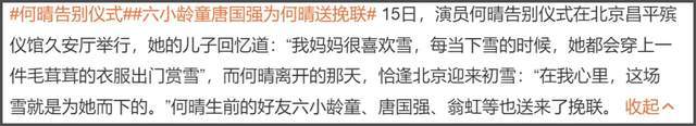 当天还有不少圈内明星到场悼念,从何晴好友等人的采访也能看出来,何晴生病之后,圈内朋友和邻居给了不少帮助,何晴还曾打电话给好友王卫国,要他送她去医院。