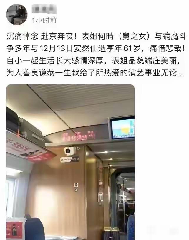 何晴的表弟已经赴京奔丧,表弟应该是姑姑家的孩子。他们自小一起长大、感情深厚。表弟眼里表姐品貌端庄美丽,为人善良谦恭,一生都献给了所热爱的演艺事业。