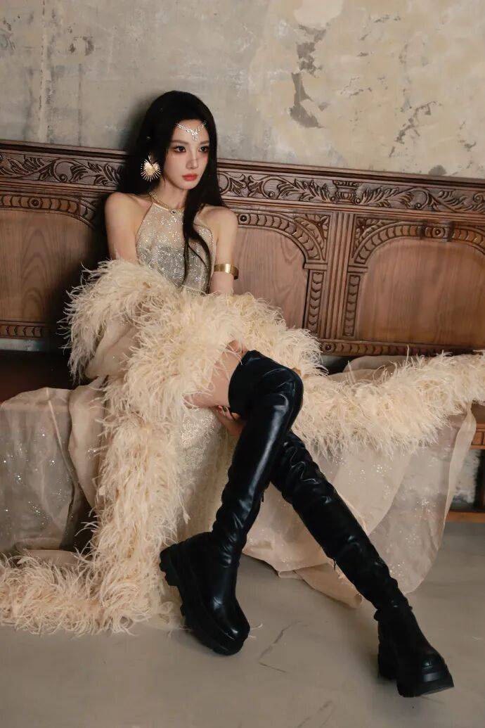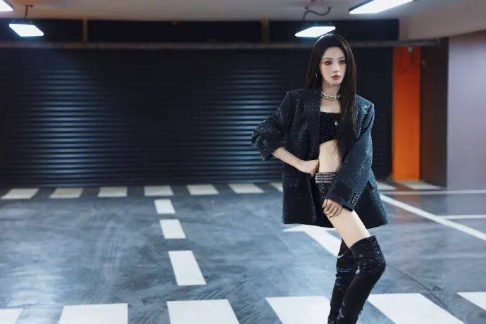 她穿着黑色闪钻抹胸衣服,搭配过膝长靴的“冬装夏穿”设计,将冷冽寒冬穿出盛夏热辣张力,被赞为“反季时尚教科书”