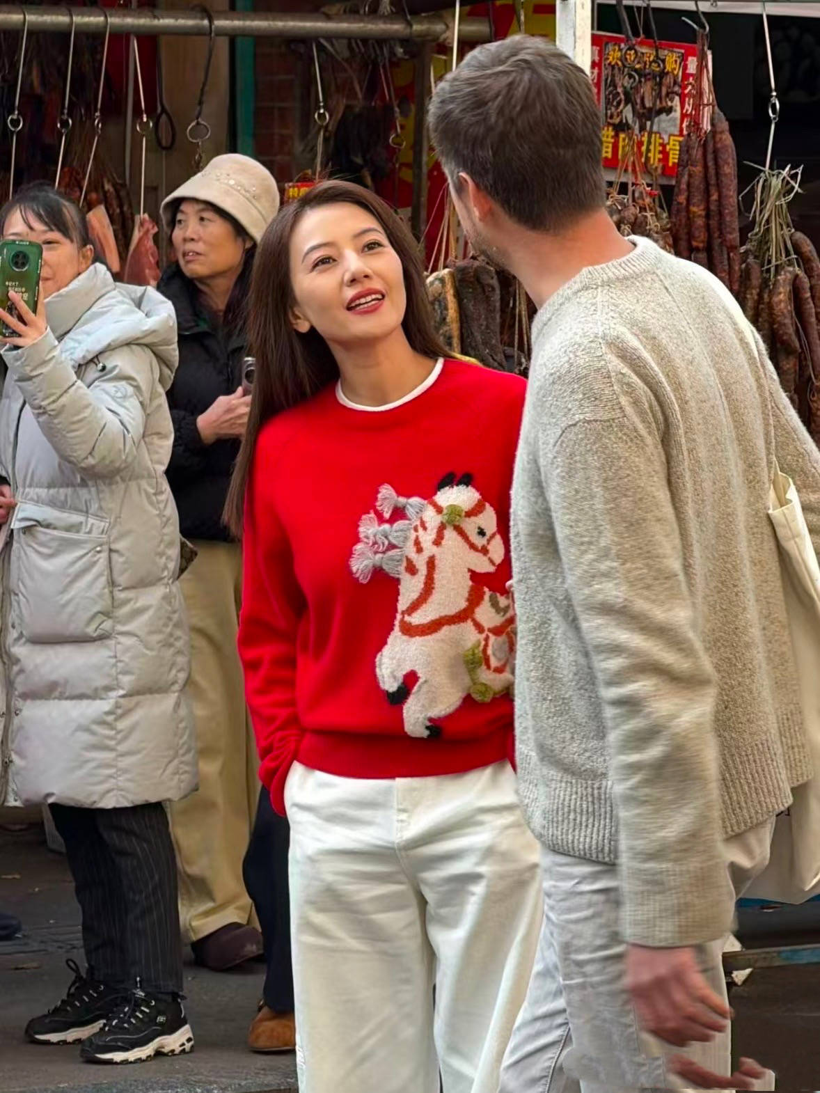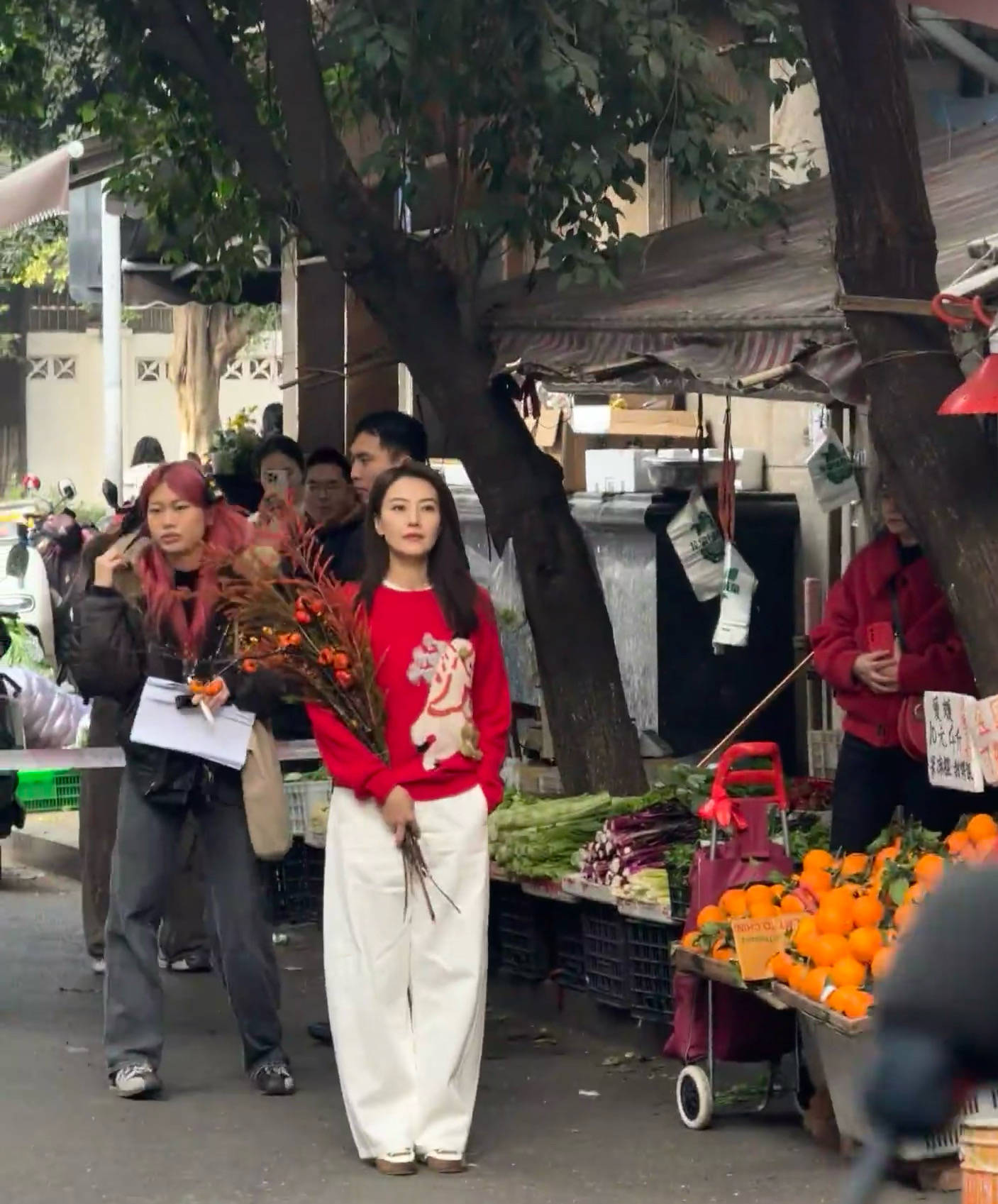 高圆圆不仅在菜市场买菜、买水果,她还买了一束好看的话。高圆圆拿着鲜花拍照,这么画面好唯美。背景是古老的街道、穿着红毛衣白裤子的高圆圆美得那么突出、醒目。