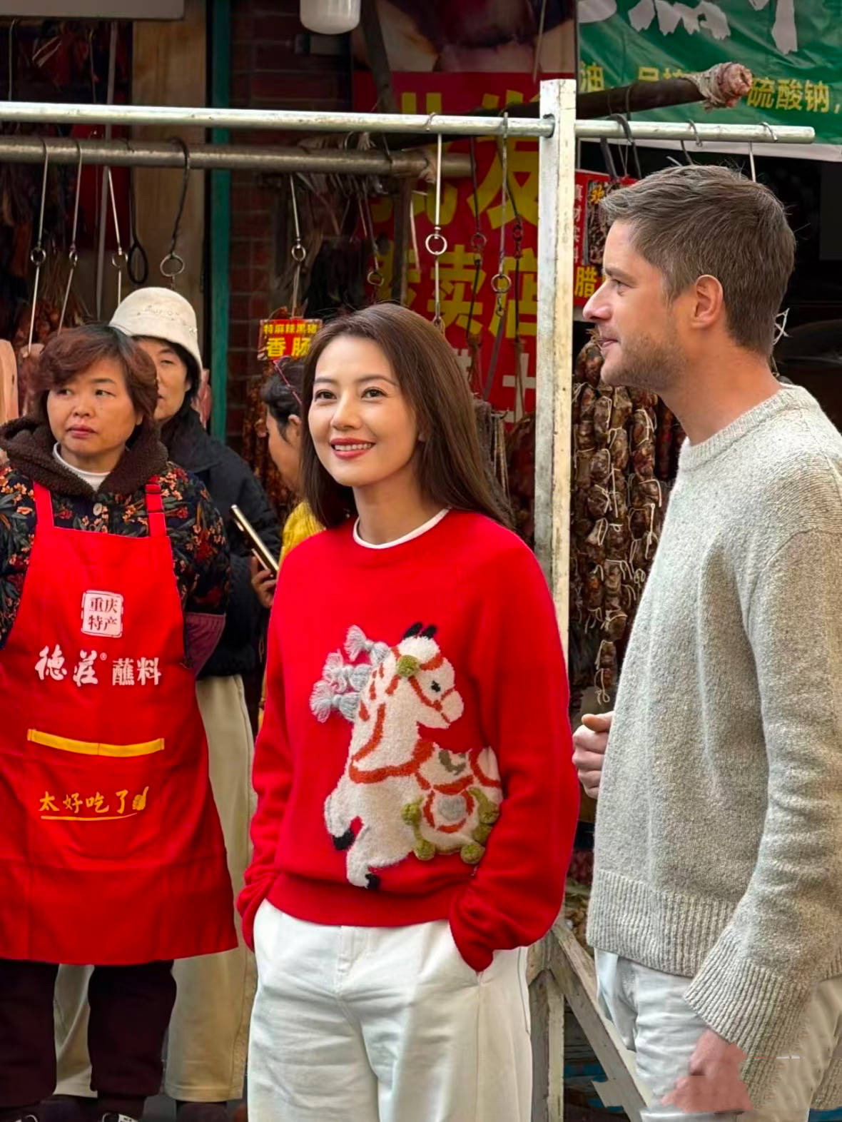 陪在高圆圆身边的是米其林主厨戴广坦,他们穿梭在菜市场中,还吸引了不少买菜的市民驻足拍照。