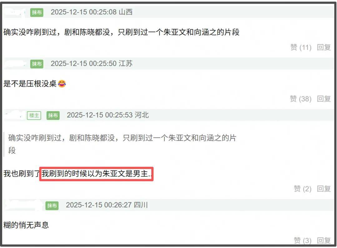 值得一提的是,在《大生意人》本就成绩一般的情况下,陈晓还被男二掀了桌。比起陈晓和孙千在剧中的主cp,朱亚文和向涵之这对剧中的副cp热度明显更出圈,甚至有网友因为刷到的相关片段太多,误以为该剧的男主演是朱亚文。