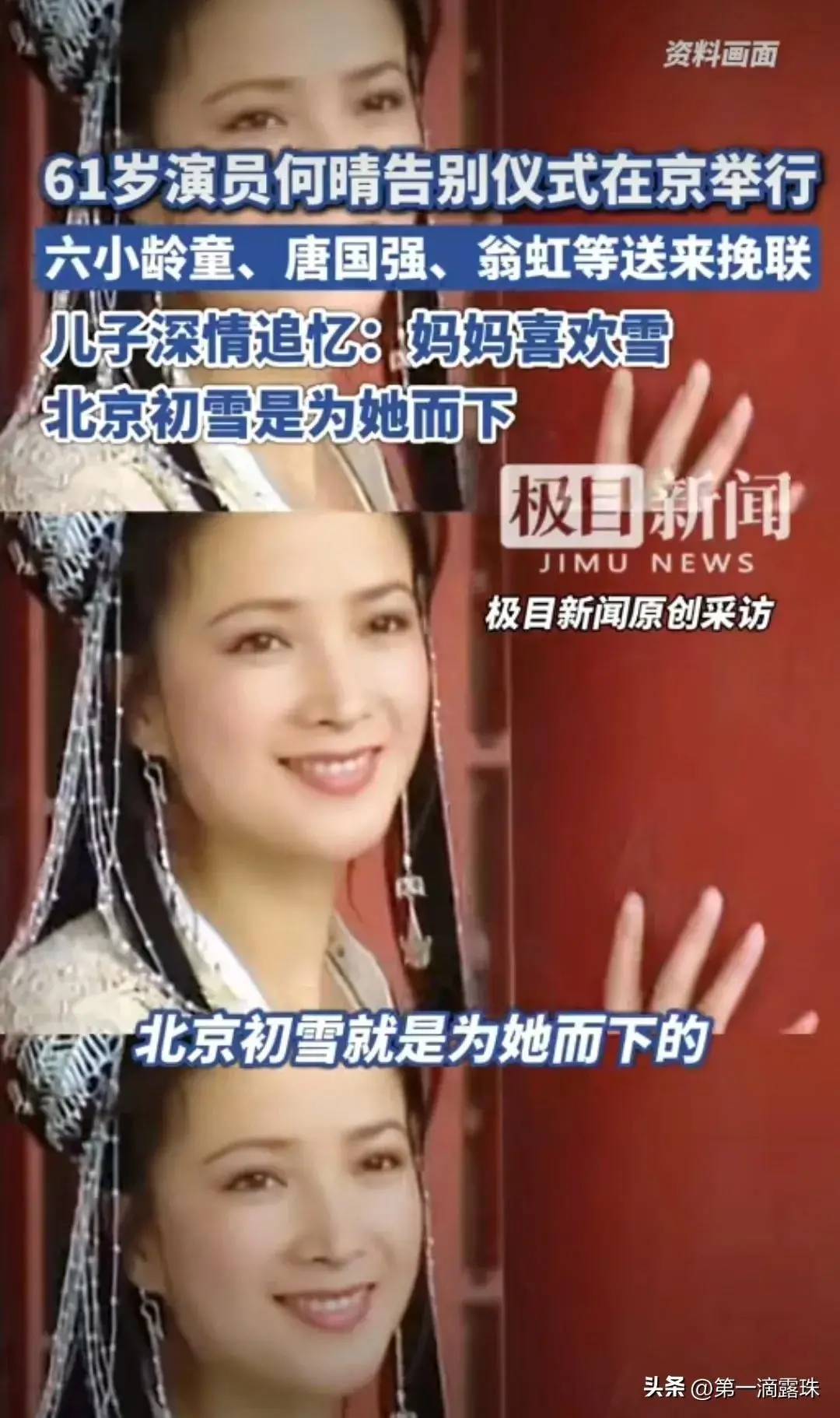 12月15日,北京昌平殡仪馆久安厅内哀乐低回,“古典第一美人”何晴的告别仪式在这里静静举行。没有喧嚣的媒体簇拥,只有亲友的哀思与影迷的眷恋,这场低调却满含深情的送别,为这位演遍四大名著的演员,画上了人生的最后一笔。而儿子许何那句“北京的初雪是为母亲而下”的哀伤追思,更让无数人红了眼眶,把离别变成了最温柔的纪念。