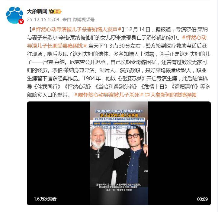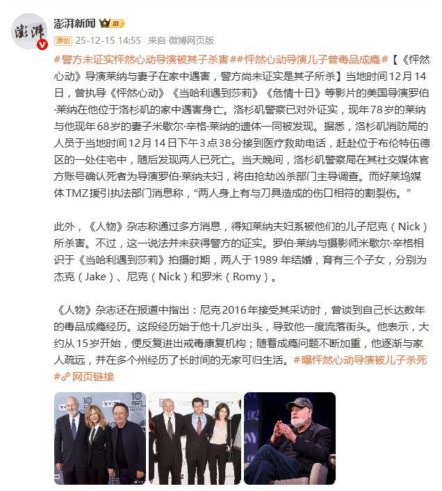 曾执导《怦然心动》《公主新娘》等经典影片的好莱坞导演罗伯·莱纳,与其妻子米歇尔·辛格的离世方式,震惊了全球影迷——不是自然衰老,不是意外,而是疑似在自家豪宅中遭遇了致命暴力。更令人脊背发凉的是,指向的嫌疑人竟是他们的亲生儿子。