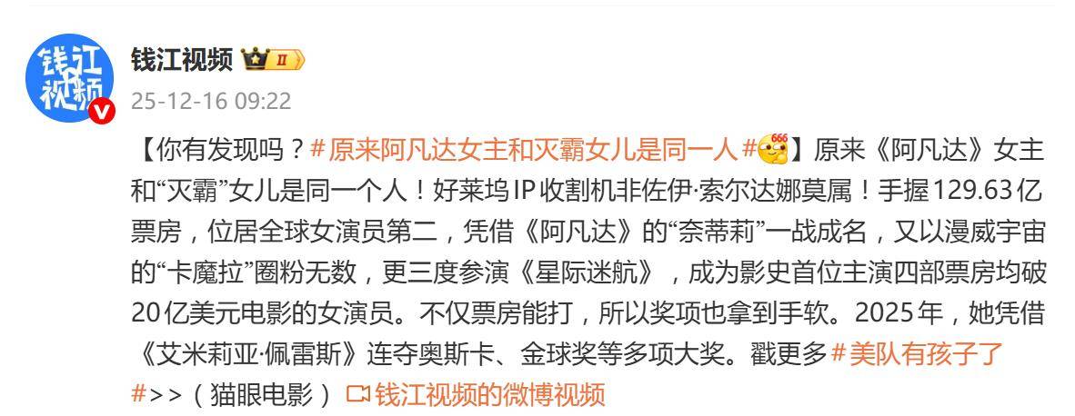 据12月16日报道,一条冷知识让不少影迷直呼“破次元壁”了:那个在潘多拉星球上纵情奔跑的蓝色纳美公主,和宇宙里让灭霸头疼的绿色养女,居然是同一位演员!佐伊·索尔达娜,这位好莱坞的“科幻专业户”,不声不响地成了全球女演员票房榜的亚军,手握近130亿美元票房,堪称行走的“IP收割机”。