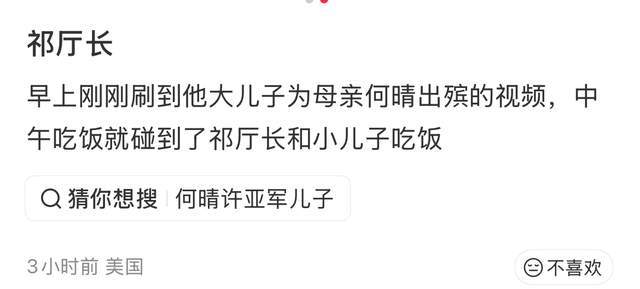 12月16号,有一位来自美国的网友晒出偶遇许亚军与幼子吃饭的画面,并留言感慨:早上刚刚刷到他大儿子为母亲何晴出殡的视频,中午直返就碰到了祁厅长和小儿子吃饭。
