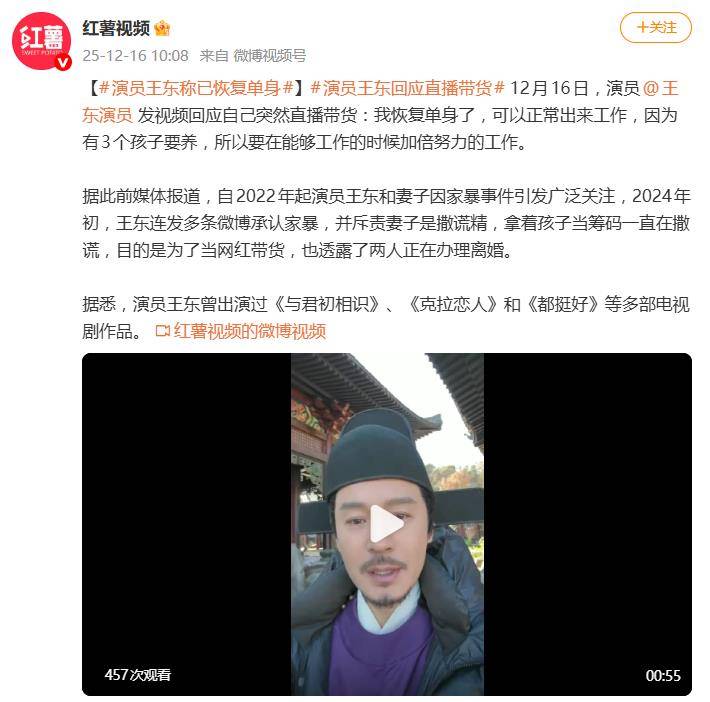 12月16日,演员王东的一则视频声明,把自己再次推上了风口浪尖。视频里,他平静宣布自己“恢复单身了”,并解释之所以突然开始直播带货,是因为“有3个孩子要养,所以