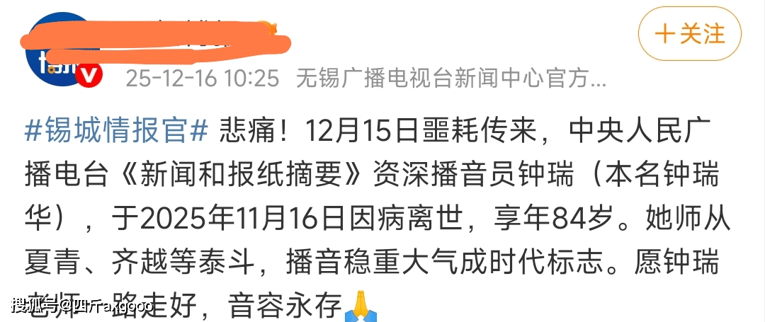 12月16日,著名播音员钟瑞在加拿大温哥华病逝的消息冲上热搜,引发网友热议。
