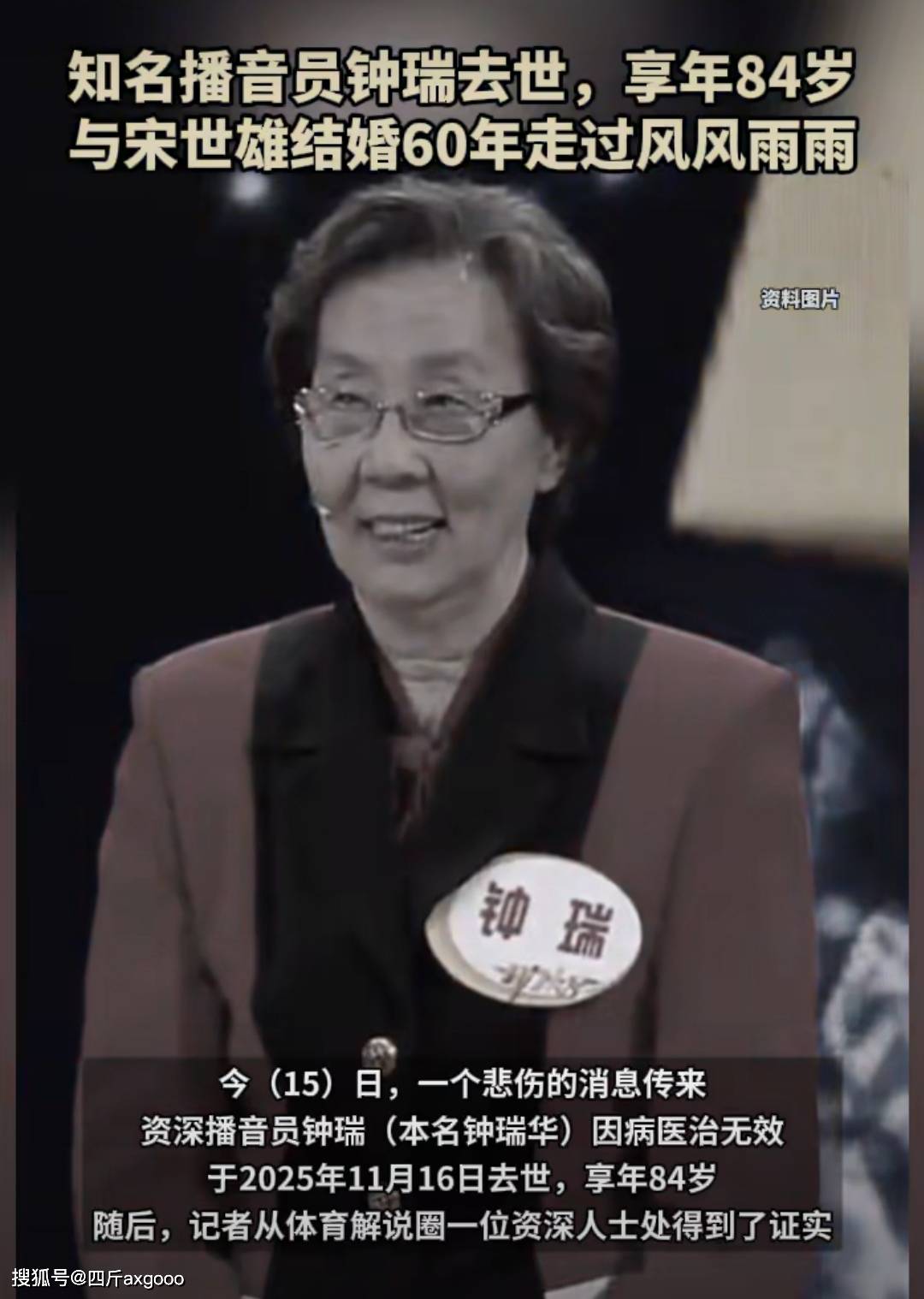 12月16日,著名播音员钟瑞在加拿大温哥华病逝的消息冲上热搜,引发网友热议。按照媒体的说法国家广播战线早期特别有名的播音员钟瑞老师也就是央视体育名嘴宋世雄先生的夫人因