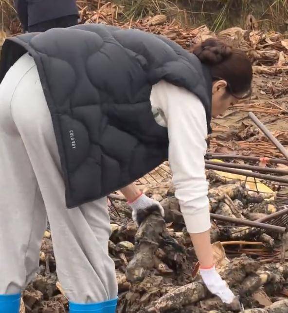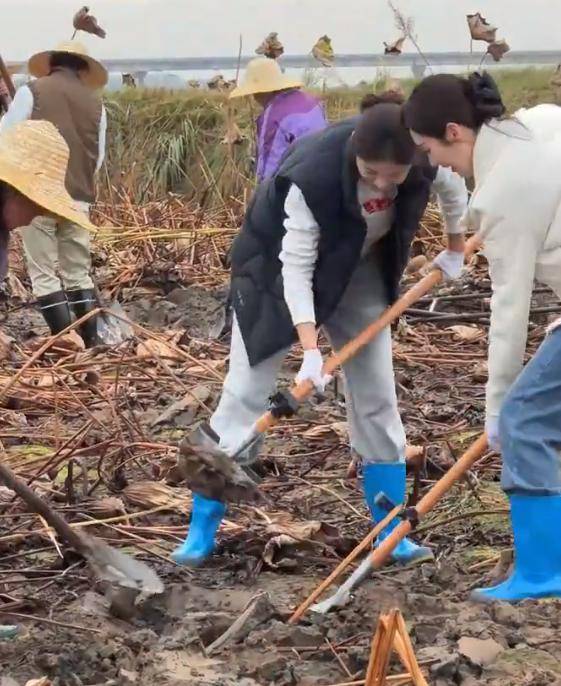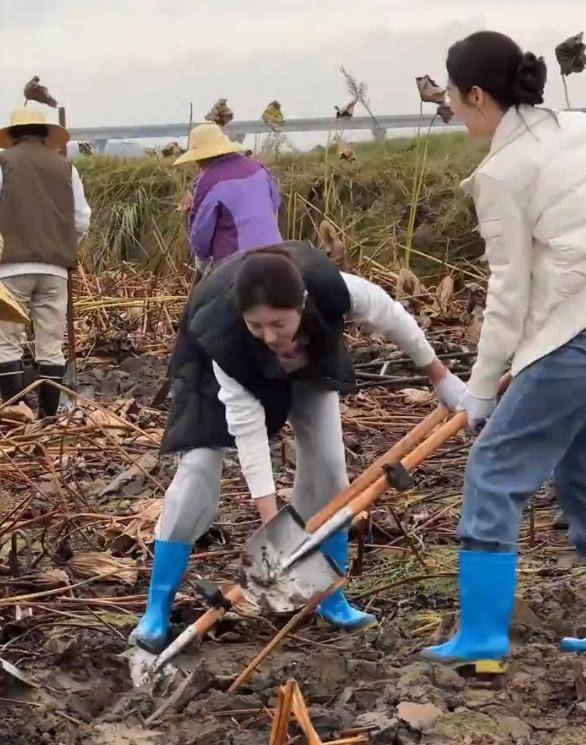 干着干着,曾黎的头上渐渐渗出了汗水,胶鞋上、手套上满是污泥的痕迹,再加上曾黎今天还是素颜出镜,这模样跟农村大妈完全没啥区别。