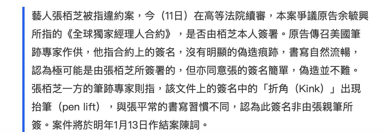 一个专家称极有可能是张柏芝签名,一个专家却称根本不是张柏芝的签名,双方各执一词。余毓兴请来的笔迹专家反驳张柏芝方请来的专家,在庭上他不同意签名有抬笔的痕迹,他称签名中的转折处只属于正常的停顿。而梁时中称透过放大镜发现合约上的签名凸起的笔触,与原笔画的书写不同,合约上的签名显得谨慎,说明签署人有停顿再落笔。总之,目前仍然是双方各有各的坚持,而到底张柏芝有没有签名,是不是张柏芝的签名,这个只能等待法官认定。