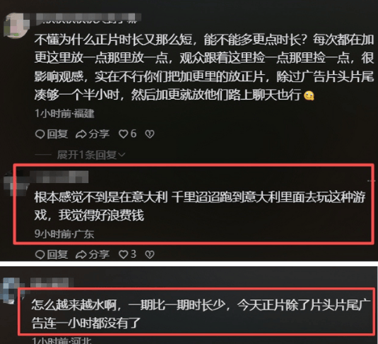 最新一期的“上集”中,一小时的时长里,嘉宾们浏览当地风景与标志物的内容就占了一半。正如观众所言,“这是我看过最水的一期”,稍有看点的游戏环节全都被放在了加更内容里,刻意拆分的痕迹十分明显。