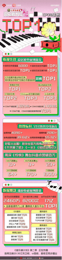 节目歌曲在音乐平台持续霸榜,总收藏量累计突破2460万,总热力值超17亿,总上榜量达8200次,在QQ音乐、酷狗音乐等主流平台占据领先位置。