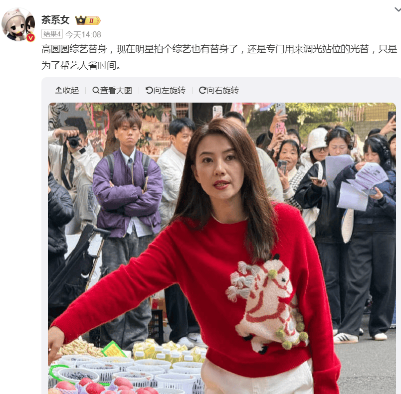 近日,高圆圆在成都玉林菜市场录制一档户外综艺节目时,一段现场偷拍视频在社交平台流传,引发“综艺替身”的讨论。画面中,一名穿着与高圆圆高度相似的工作人员提前出