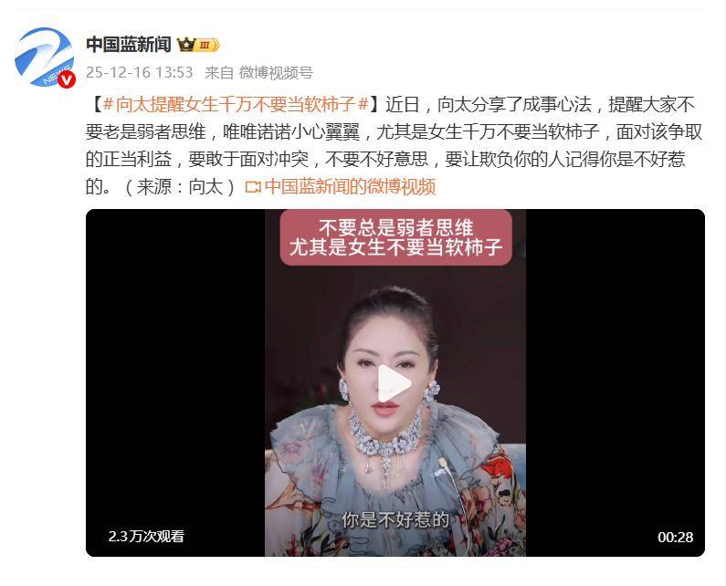 据12月16日报道,最近,向太陈岚一句“女生千万不要当软柿子”的犀利发言,直接冲上热搜,给不少习惯性退让的女生心里扔了颗“醒脑丸”。她分享成事心法,提醒