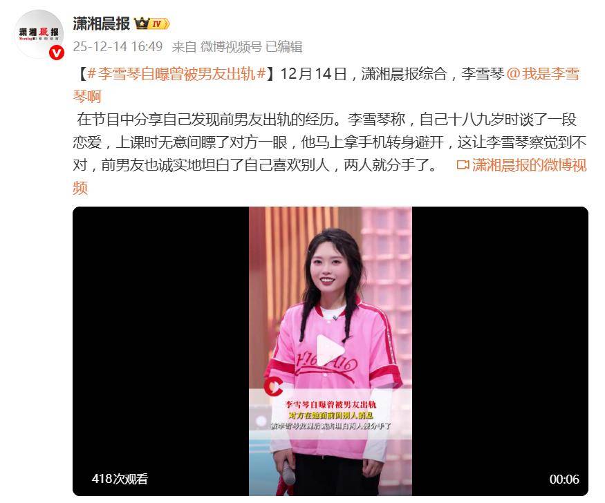 据12月14日报道,李雪琴在综艺《毛雪汪》里一段关于“如何发现前男友出轨”的分享,直接贡献了年度“抓包”名场面。没有狗血撕扯,没有长篇质问,仅仅是一个心虚的转身动作,就让一段青春恋情火速画上句号,其过程之“干脆利落”,让网友直呼“这渣男连戏都不做全套”。