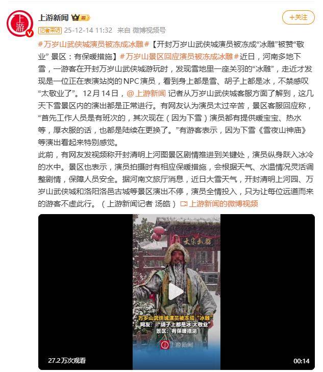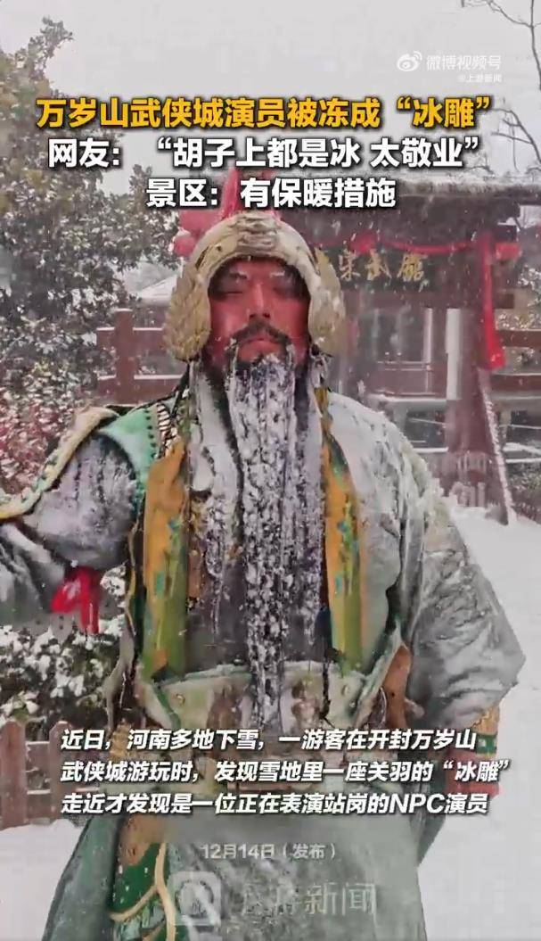 近日河南大雪,开封万岁山武侠城的一张游客照却意外“火”出了圈。照片里,一位扮演关羽的NPC演员在风雪中巍然站立,身上落满积雪,胡须挂满冰凌,远看宛如一尊生动的“冰雕”。游客走近才惊觉是真人,不禁感叹“太敬业了”。这一幕迅速引发网络热议,将景区与演员一同推上了风口浪尖。
