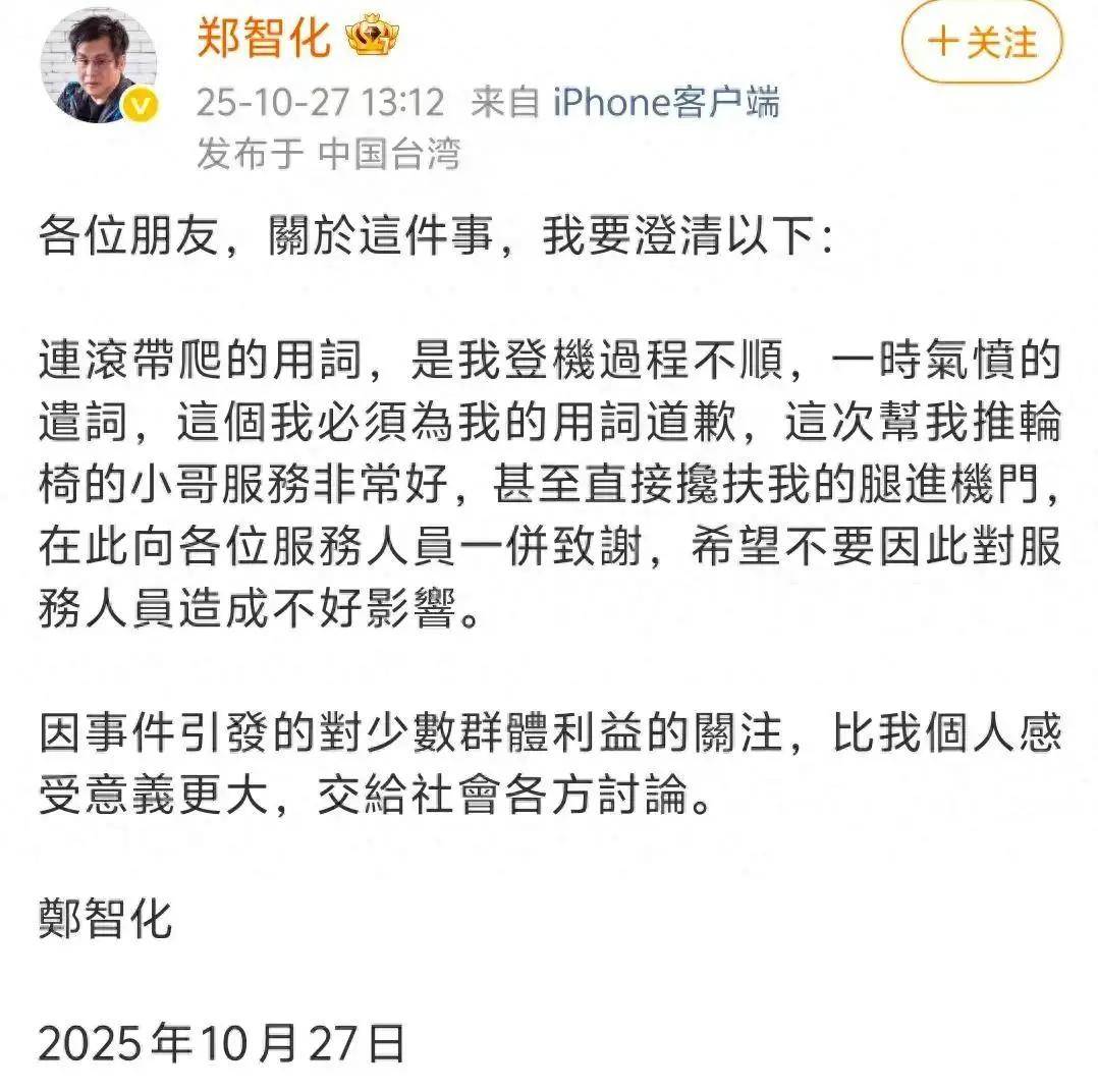 他说“连滚带爬”这个词,是自己“登机过程不顺,一时气愤的遣词”,为此郑重道歉。