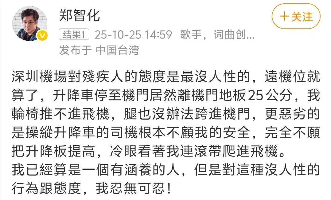 第二天,郑智化也发微博,说接受了机场的道歉,自己不再追究了,还夸了深圳和深圳人。