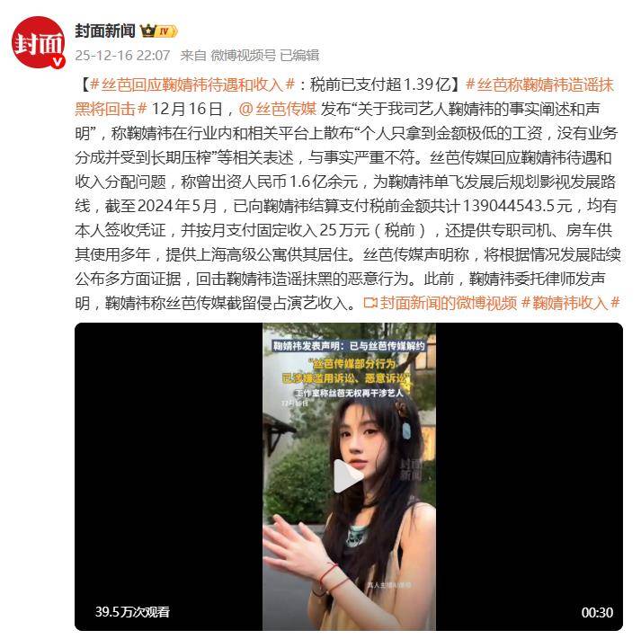 面对如此指控,丝芭传媒的反驳同样火力全开。公司坚称补充协议合法有效,合约理应持续,并单方面公布了另一份笔迹鉴定报告,声称签名真实。此外,丝芭还罕见地公布了一组经济数据,试图在舆论场扳回一城:公司宣称,在合作的11年里,支付给鞠婧祎的“税前综合收入”高达1.39亿元(含公司运营成本),并强调为其提供了房车、江景公寓等全方位资源支持,暗示己方“仁至义尽”。