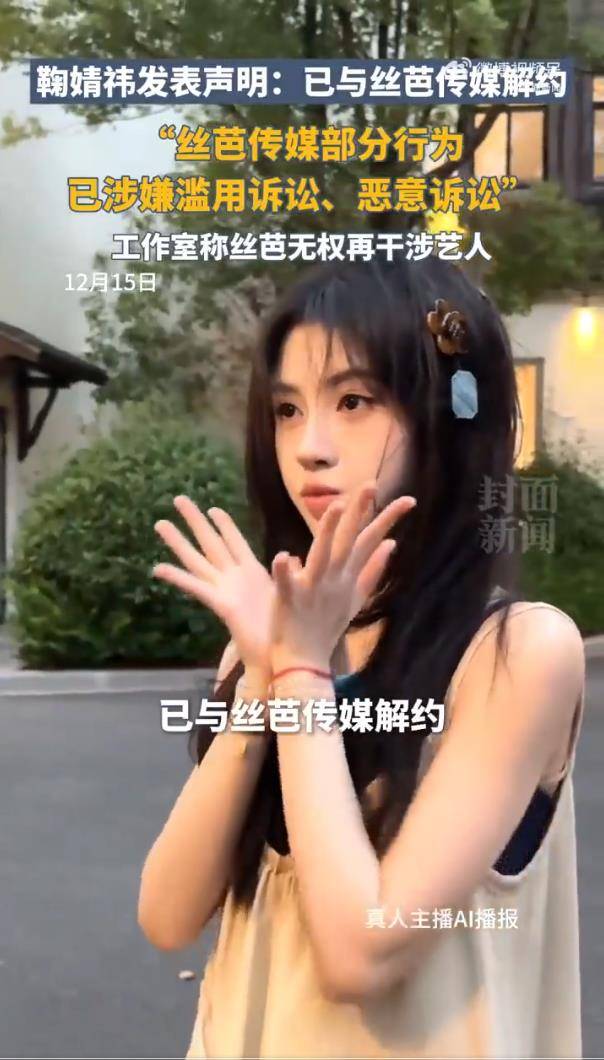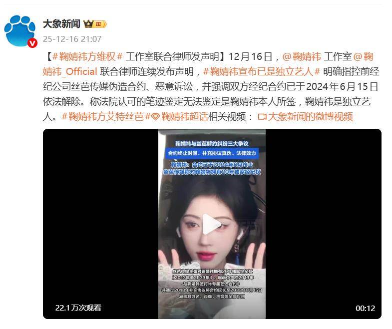 一纸声明,再次将顶流小花鞠婧祎与前东家丝芭传媒的合约纠纷推上了风口浪尖。12月16日,鞠婧祎工作室联合律师的强硬声明,不仅直指对方“伪造合约、恶意诉讼”,更抛出