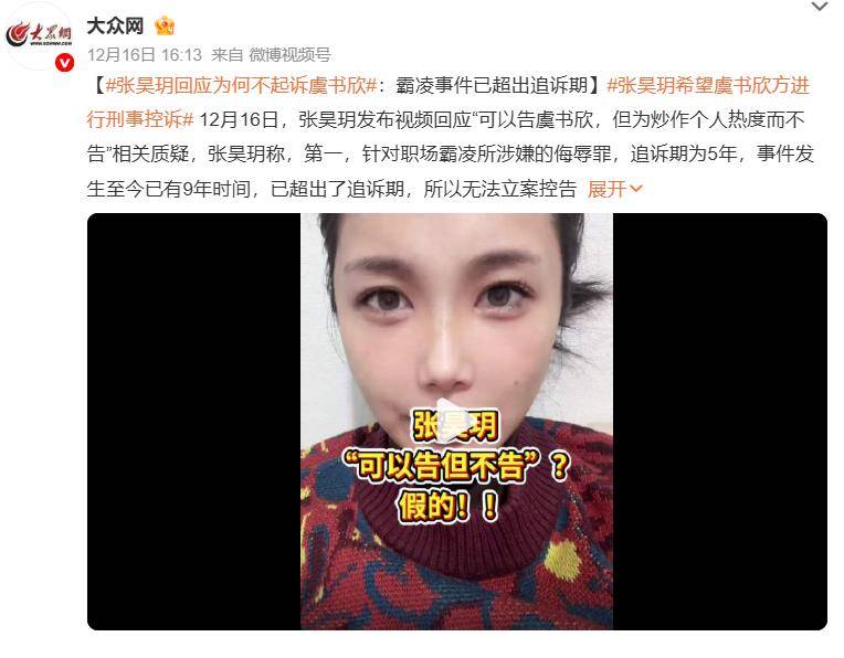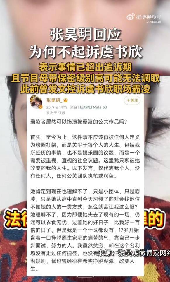 “可以告,但为了炒作个人热度而不告”——面对网络上的尖锐质疑,演员张昊玥于12月16日通过视频作出系统性法律回应,将一场持续数月的“霸凌罗生门”推向更为冰冷的程序战场。她明确指出,九年前综艺节目中的争议事件,在法律层面已因超过追诉期限而无法立案,同时反向喊话虞书欣方:“如果我说的是假的,请你现在就来告我。”
