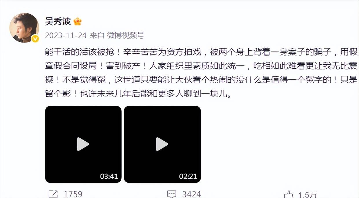 当时,吴秀波发文怨恨地写道:能干活的活该被抢!辛辛苦苦为资方拍戏,被两个身上背着一身案子的骗子,用假章假合同设局!害到破产!人家组织里素质如此统一,吃相如此难看更让我无比震撼!不是觉得冤,这世道只要能让大伙看个热闹的没什么是值得一个冤字的!只是留个影!也许未来几年后能和更多人聊到一块儿。