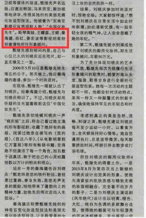 值得一提的是,甄继先名声远扬后,斯琴高娃、王馥荔、王姬、秦海璐、岳红、姜宏波等影视明星,纷纷邀请他当形象顾问,而他与刘晓庆相识,还是秦海璐介绍的。