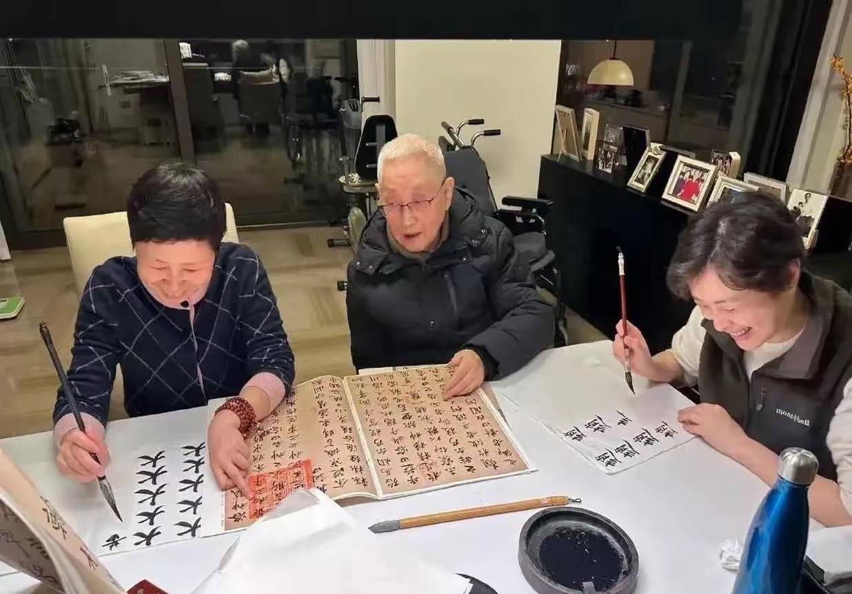 一家人搬进大平层后,吴越也经常陪伴父母。他们围在书桌上练字,84岁的父亲作为指导,时不时的提出几句点评,有说有笑的也很开心。