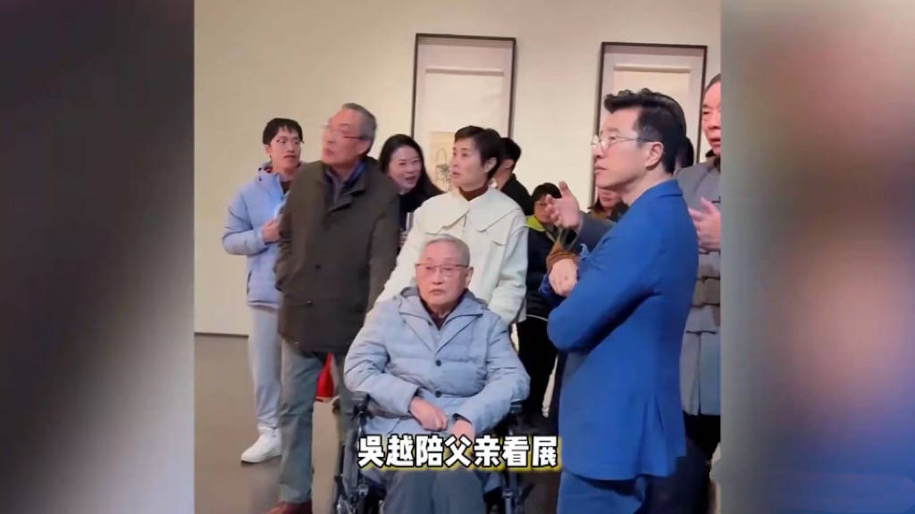 即便是父亲摔伤、中风之后只能坐轮椅,吴越也会推上他一起出门看画展。老爷子穿得干净利落,一看就是被照顾的很好。