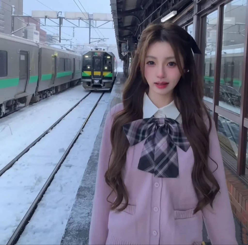 穿香芋紫的针织衫、白衬衫,同色系百褶短裙,俨然是学院风的打扮。长发披肩,就连头发丝弯曲的弧度都刚好修饰出柔美的脸部线条。