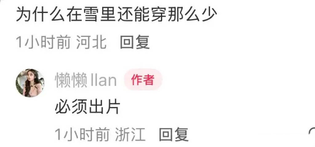 不少粉丝直白的问懒懒,为什么在雪地里还能穿那么少。懒懒回答“必须出片”!出片是必须的,卖衣服是她的事业。这个女孩子聪明果敢,即便傍上了王思聪,也没有放弃自己的工作。